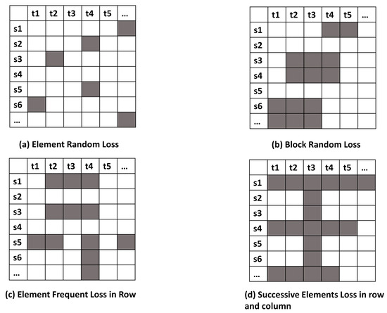 Missing data reconstruction methods are further challenged by the variation in patterns of missing data [24,25]; for example, missing data completely at random, non-random missing data [26], or whole blocks of missing data [27] (Figure 1). The work in [10] formulates the spatio-temporal sensory data as a high-dimensional tensor, using the tensor completion method to recover missing values. However, when a whole temporal or spatial dimension of the data is missing, this method may fail. The same problem exists for other spatio-temporal interpolation methods (e.g., IDW, kriging, P-BSHADE, ST-IDW, ST-kriging, ST-HC). Furthermore, most existing methods assume a linear relationship between spatial and temporal data (e.g., ST-HC, ST-IDW, ST-kriging); however, the relationship between spatial and temporal data may be linear or nonlinear. To address these issues, in this study, we developed a new two-step method to reconstruct missing spatio-temporal data (ST-2SMR).