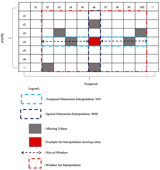 In the spatial dimension, we used a classical multivariate statistical model (IDW) to interpolate missing data. IDW adopts the observed data of adjacent space points to estimate unknown data [11,28]. When the distance of the adjacent space points is closer to the point of interpolation, the spatial contribution value is larger. Interpolation estimates for missing data are calculated as follows: