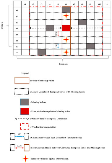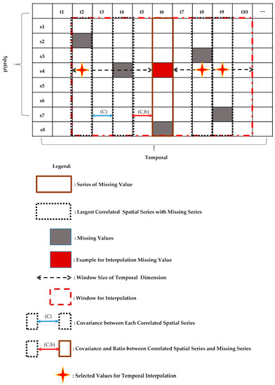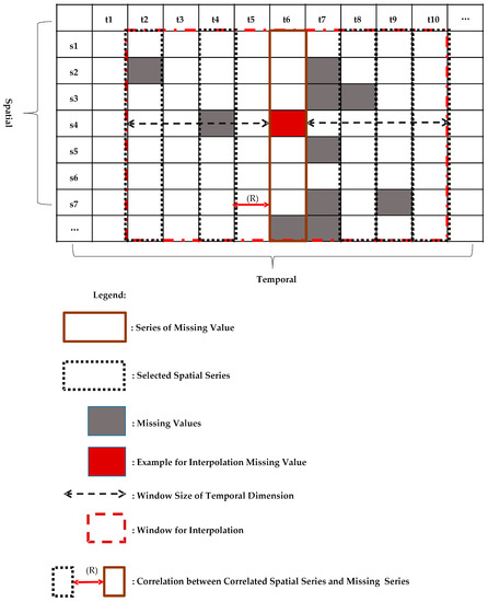 Suppose that represents a spatio-temporal missing dataset, where S and T are the spatial and temporal dimension, respectively; , , m is the total number of spatial objects and n is the total number of timestamps. An entry refers to the value of the -th spatial object at the -th timestamp . The definition of the size of the sliding window is (). If there exist , then is a complete temporal sequence. If there exist , then exists, missing at the j-th timestamp. Similarly, if there exist , then is a complete spatial sequence. If there exist it means that exists, missing at the -th spatial object.