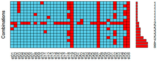 The different air quality variables have different degrees of missing data (Table 1). Among them, only PM2.5 contains a complete case. For the other attributes, we used combination analysis to explore the patterns of missing spatio-temporal missing data (Figure 9).