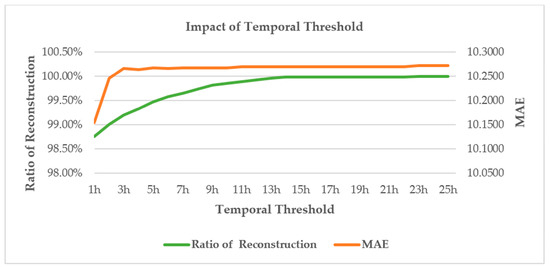 According to Algorithm 1, the results of coarse-grained interpolation are mainly affected by the decay rate of weight , smoothing parameter and by time threshold wc. According to the experimental results of [27], performed using the same PM2.5 dataset, IDW and SES achieve a minimum MAE value when = 4 and = 0.85. For the time threshold, different values exert a significant influence on the coarse-grained interpolation results. In this study, we determined heuristically, with the value initially set to one (i.e., the center of missing data, taking the first hour and last hour as the sample data). With the increase in , the reconstruction rate of the missing data increased until complete reconstruction was achieved (Figure 10). We found that MAE was smallest when = 1 and stable when > 3. At > 3, the contribution weight of the sample data for missing data was nearly equal to zero, resulting in a small effect on the interpolation results. Furthermore, the termination condition of was set to ensure no continuous deletion of the whole space sequence and time series after coarse-grained interpolation, so as to obtain a complete interpolation result in the fine-grained interpolation. When < 14, the dataset from the coarse-grained interpolation still exhibited complete missing data in both the time and space sequences (Figure 11); therefore, fine-grained interpolation was required to achieve reconstruction. When = 14, coarse-grained interpolation eliminated the influence of successive missing data, so the reconstruction rate was 100%.