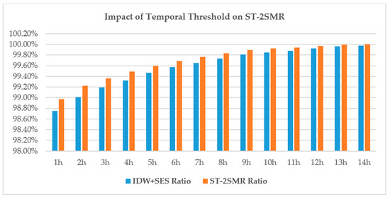 During fine-grained interpolation, we were required to select spatial neighbors and temporal neighbors for missing data. The number of sample points impacted the assessment results. Too few sample data points fail to reflect the correlation of spatial and temporal data, while excessive sample data increase computational complexity and also reduce the accuracy of assessment because of redundant data. According to the experimental results of [16], when the number of sampling points is set to between five and 15, the interpolation results are perfect; therefore, we set three sets of adjacent point selection patterns (5, 10 and 15) in both the spatial and temporal dimensions (i.e., a total of nine sets of experiments) and performed experiments to determine the most suitable number of samples. When = 10 and = 10, the ST-2SMR method achieved its best performance (Table 5); however, the results show that the number of neighbor points had no effect on the reconstruction rate. This result reflects the elimination of continuous missing data during coarse-grained interpolation, which meant that all missing data had access to observed data for interpolation, allowing the whole dataset to obtain corresponding estimates.