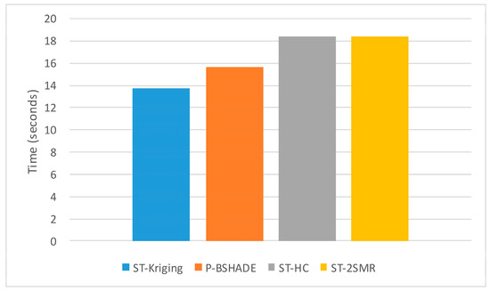 The computational efficiency is also an important factor worth evaluation for missing data reconstruction. We conducted a comparison of the computational efficiency on a 3.4-GHz Intel i7 CPU, with a 64-bit operating system, and 16.0 GM RAM. The CPU time costs of each interpolation method in the forecasting stages (i.e., we select 10% of samples as a test dataset) are shown in Figure 14. The computational efficiency of all of the four methods has no distinct difference. Obviously, ST-kriging is the fastest one among the interpolation methods because it does not take into account the effects of spatial and temporal heterogeneity on interpolation results. ST-HC and ST-2SMR consume only a little more time than ST-kriging and P-BSHADE because they are the extensions of P-BSHADE and consider the temporal and spatial heterogeneity. In addition, the linear combination of ST-HC to integrate spatio-temporal interpolation results almost spends the same time as nonlinear ways using a trained neural network, so the time complexity of ST-HC and ST-2SMR is nearly the same. However, the ST-2SMR method makes a significant trade-off between the efficiency and accuracy because the MSEs resulting from other methods are far larger than that of ST-2SMR (see Table 3). Therefore, when both efficiency and accuracy are considered, the proposed ST-2SMR outperforms the other methods.