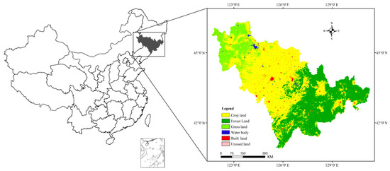 The study area is Jilin Province, which is located in northeastern China (40°50′–46°19′ N and 121°38′–131°19′ E) (Figure 1). It has an area of 187,400 km2, which is 2% of China’s total area. The eastern area of the province is mountainous and the central and western areas are plains. Crop land, forest land, and grass land cover 84.1% of the province’s total area. The crop and grass land is mainly distributed in the central and western plains and the forest land distributed in the eastern mountainous. Agriculture and forestry are the primary economic activity. This province is not only a major grain production area, but also boasts a rich biodiversity and important ecological functions. Over the last 15 years, this province has undergone some profound changes. The population increased from 27.04 million inhabitants in 2003 to 27.51 million in 2013. The economy has also grown and the urban built-up area has expanded rapidly.