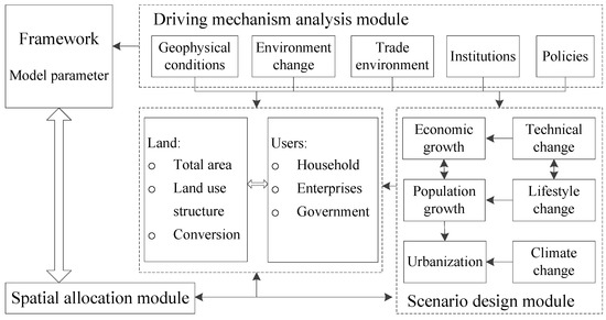 The DLS model is composed of three modules: the scenario design module, the driving mechanism analysis module, and the spatial allocation module (Figure 4). The scenario design module provides the annual demand of each land use class. The driving mechanism analysis module calculates the spatial statistical relationship between land use distribution and the driving factors, and it analyzes the driving factor’s influence on the land use distribution. The spatial allocation module creates the spatial distribution of land use change based on land supply and demand balance analysis.