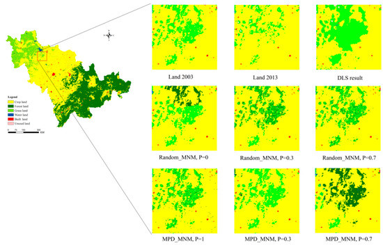 Based on the transition maps, the Kappain-out series’ scores are calculated, and the results are shown in Figure 9. The change trend for the Kappain-out scores of the modified neutral model results is similar to those for the Kappa scores (Figure 9a). However, the relative relationship between the modified neutral model and DLS results for the Kappain-out scores is different. The Kappain-out scores of all the modified neutral model results are less than 0.1, which means that there are fewer of the same class transitions that appear in both the modified neutral model and in reality. The DLS model has the highest score of 0.47, and this indicates that the DLS model has more accurate class transition simulations than the modified neutral model. The results for the transition locations show that the MPD_MNM result for p = 0.7 has the closest score to that of the DLS model (Figure 9b). In terms of the land use transition quantities (Figure 9c), the DLS model outperforms all the modified neutral model results, which is the exact opposite of the Kappahistogram comparison result.