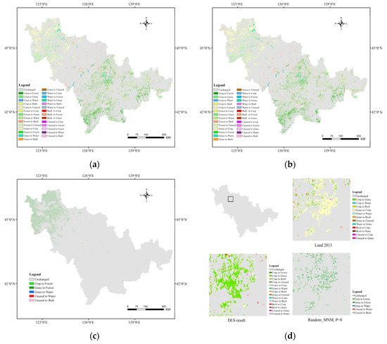 Land use transition maps: (a) Land 2013 map; (b) DLS result; (c) Modified neutral model, Random_MNM, p = 0 as an example; (d) Sample maps of the transition maps.