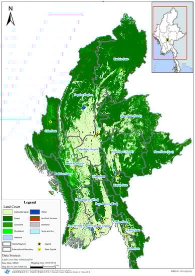 Myanmar lies between latitudes 9° and 29° N and longitudes 92° and 102° E, and covers a total area of 678,500 square kilometers. Myanmar is bordered by India and Bangladesh to the west, by Thailand and Laos to the east, and by China to the north and northeast. To the south, roughly one third of Myanmar’s perimeter of 5876 km (3651 miles) forms an uninterrupted coastline of 1930 km (1200 miles) along the Bay of Bengal and the Andaman Sea. Much of the country lies between the Tropic of Cancer and the Equator. The country lies in Asia’s monsoon region with its coastal regions receiving over 5000 mm of rain annually. Annual rainfall in the delta region reaches approximately 2500 mm, while levels reach less than 1000 mm in the Dry Zone of central Myanmar. As of February 2011, Myanmar consisted of 14 states and regions and of 330 townships. According to the country’s 2014 census, Myanmar has a population of 51 million. Myanmar is an agricultural country with its main agricultural product being rice, accounting for roughly 60% of the country’s cultivated land area [45]. The country’s cultivated land is mainly distributed across the country’s central and southern regions as showed in Figure 2.
