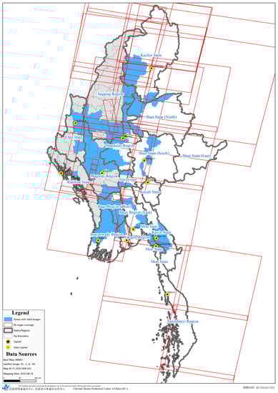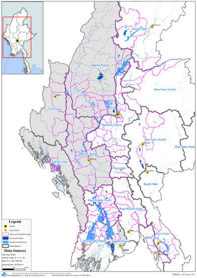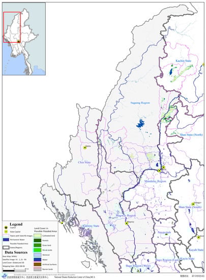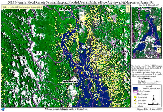 From July to August 2015, Myanmar was hit by a major flood disaster with multiple landslides upon the onset of heavy monsoon rains in combination with the KOMEN typhoon occurring on 30 July 2015. According to MSWRR statistics, by the end of August 2015, the flood had affected 12 of Myanmar’s 14 states and regions and 1.6 million people, of which at least 117 lost their lives. More than 390 ha of arable land and considerable infrastructure services were destroyed [47]. On 31 July of that year, the President of Myanmar declared the Chin and Rakhine states and Magway and Sagaing regions as flood disaster zones and welcomed international assistance. One national satellite emergency mapping and satellite operations agency, the National Disaster Reduction Center of China (NDRCC), is responsible for emergency mapping not only for natural disasters in China, but also for other countries. The NDRCC has provided mapping services in support of more than 20 major disaster emergencies occurring in other countries. At Myanmar’s official request, the NDRCC coordinated four Chinese earth observation satellites and provided satellite imagery and mapping services integrated with global open datasets for the flood emergency response.