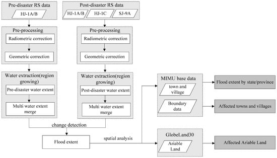 Flood impacts were estimated from the acquired images over five phases as shown in Figure 5. First, all of the satellite images were subjected to radiometric and geometric correction pre-processing. Next, water body information was extracted via the region growing method [49] based on each scene of satellite images after pre-processing for pre- and post-disaster images. Third, all extracted pre-flood water body coverage polygons based on each image frame were geo-merged into one layer as pre-flood water body coverage data. All of the extracted post-flood water body coverage polygons were then geo-merged into one layer as post-flood coverage data. Fourth, the flood extent was determined through a comparative analysis and based on changes in pre- and post-flood water body coverage. Finally, GL30 and MIMU data were used as exposure elements to estimate the impacts of floods on administrative units, cropland, and human settlements using the flood extent information.