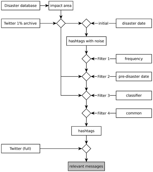 Toponyms and coordinates defined using disaster databases (Section 2.3) are used to retrieve messages from the 1% Twitter archive. Hashtags extracted from these messages represent several social phenomena in the defined region related to the disaster and to ordinary life (e.g., shopping, birthday) and long-term overlapping events of different origin (e.g., election campaigns). For this reason, we propose several heuristics (filters) to remove non-disaster hashtags.