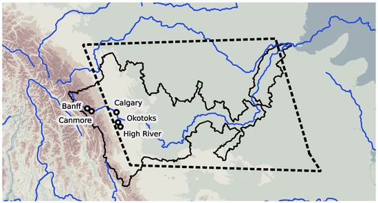Region affected by the 2013 Alberta flood, Canada. South Saskatchewan river basin (solid line), polygon from the GAALFE dataset (dashed line).