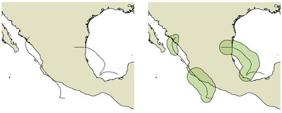 International Best Track Archive for Climate Stewardship (IBTrACS [18,19]) represents information about cyclones in track form. The affected area should be reconstructed using additional process parameters. One of the cyclone hazard factors is wind speed. It is recorded in the form of the radii of wind speed that exceeds 34-knot thresholds (higher level radii are not important in this case). For a reasonable approximation, these radii, four for every cardinal direction, can be reduced to the one maximal radius (Figure 3). If the maximal wind speed of a cyclone is less than 34 knots (such as a “tropical depression”, according to some classifications), then it can be recommended to use a constant radius, e.g., 20 nautical miles.