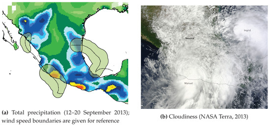 Rainfall is the most dangerous cyclone factor; it triggers floods and landslides and contributes to much of the human loss. In 2013, two hurricanes, Manuel and Ingrid, hit the territory of Mexico almost at the same time: 13–19 September (Manuel) and 12–17 September (Ingrid) [26,27]. Most of the victims of the hurricanes were reported from three spots (yellow and red colors on Figure 4a). The total precipitation represents the most accurate disaster impact and is consistent with on-site reports. However, in the case of two simultaneous disasters in the same region, e.g., cyclones Manuel and Ingrid, it is practically impossible to separate rainfall into two parts according to the initial cyclones. Cloudiness also does not facilitate disambiguation (Figure 4b).