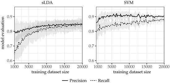 To estimate a sufficient size for the training dataset, messages were chosen from the category “flood”, and the model was trained using datasets of different size. Figure 5 shows that the stabilization of the education process was reached when the size of the training dataset was approximately 10,000 messages for the sLDA model (and 13,000 for SVM). These values can be treated as the minimum required dataset size for every disaster category.