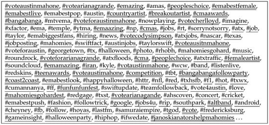 - Twubs: Hashtag Directory. Available online: http://twubs.com/p/hashtag-directory (accessed on 25 January 2017).