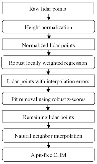 The flowchart of the proposed algorithm for pit-free CHM construction is shown in Figure 1. As can be seen, the main steps are robust locally weighted regression (RLWR) and pit removal using robust z-scores. As in the case of outliers in statistics, data pits can be defined as the observations having large z-scores with respect to interpolation errors. In the presence of data pits, a robust interpolator should be used to interpolate lidar points. Here, RLWR is adopted due to its simplicity, robustness, and high accuracy with densely distributed data sets [23]. Then, observations with robust z-scores exceeding a tolerance (i.e., 2.5) are flagged as data pits.