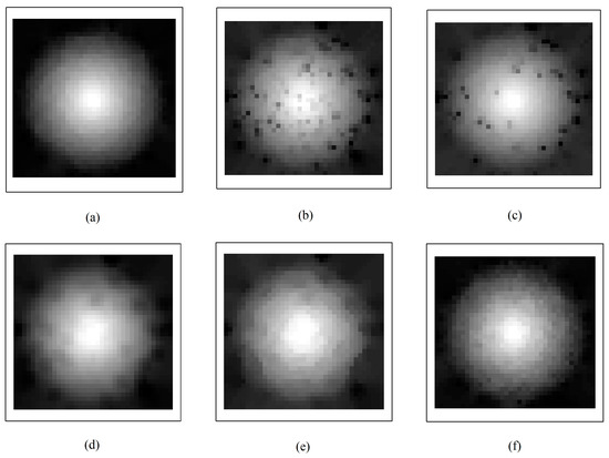 Figure 2 shows CHMs of the cone model constructed by different methods with the original points and contaminated points under α = 10%. The raw CHM has many data pits randomly distributed in the image (Figure 2b). Among the pit-free algorithms, HPM yields the poorest result, because many data pits are clearly visible (Figure 2c). This is because some of the highest points still contain data pits. Even though the mean filter removes data pits, it produces smoothed square artifacts (Figure 2d). Both the median filter and our method are successful in removing data pits (Figure 2e,f). This is expected, as the two methods have high breakdown values, especially the median filter with a value of 50%. However, both filters alter the values of all CHM cells; this results in a slight distortion of the crown shape in the right-bottom (Figure 2e). The proposed method (Figure 2f) yields the best result, which closely approximates the original (Figure 2a).