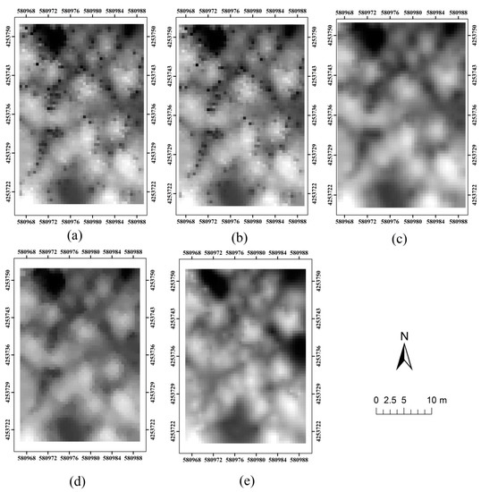 Taking one plot as an example, Figure 4 shows the 0.5-m CHMs produced by different methods. The raw CHMs made by the NN interpolation are seriously influenced by data pits (Figure 4a). The CHM of the HPM appears visually similar to the original, indicating the poor performance of HPM in terms of the removal of data pits (Figure 4b). Mean and median filters (Figure 4c,d) eliminate the data pits; however, their CHMs are heavily blurred compared to the original. Our method performs better than the others for removing data pits, while preserving the edges, shapes, and structures of canopy gaps and crowns (Figure 4e).