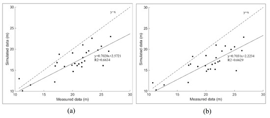 Figure 5 shows the relationship between the measured and simulated plot-level maximum tree heights for the 30 plots. For the mean and median filters (Figure 5a,b), the linear models explain ~66.3% of the variation of plot-level maximum tree heights, whereas HPM (Figure 5c) and our method (Figure 5d) explain ~71% and 73%, respectively. The new method is more accurate compared to the classical methods, because the points of our method approximate the line y = x more closely than those of the other methods.