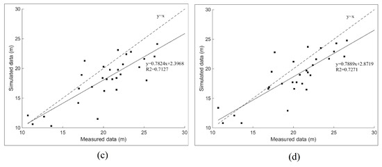 Relationship between the measured and simulated plot-level maximum tree heights for the 30 plots. (a) Mean filter; (b) median filter; (c) HPM; and (d) our method.