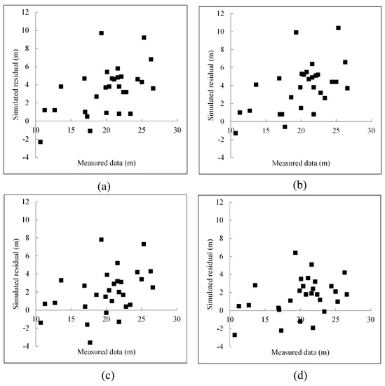 Relationship between the measured plot-level maximum tree heights and simulated residuals, i.e., difference between measured and simulated plot-level maximum tree height, for the 30 plots. (a) Mean filter; (b) median filter; (c) HPM; and (d) our method.