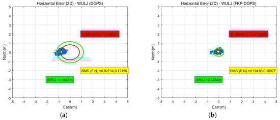 Figure 17 shows the horizontal and vertical position errors of the DGPS and FKP-DGPS of the WULJ RS, which is the farthest from the static user, in the ENU coordinate compared to the reference positions obtained using the Trimble NetR9 receiver with post-processing Trimble Business Center (TBC) software. The results are similar to the static test results. We can easily confirm that the horizontal result of the DGPS is slightly biased to the west side, whereas the FKP-DGPS obtains a more accurate horizontal positioning than the DGPS. Table 7 and Table 8 list the detailed numerical results along with the results of other stations.