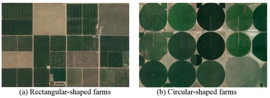 Aerial images showing farm shapes in Google Maps. (a) shows rectangular-shaped farms and (b) shows circular-shaped farms.
