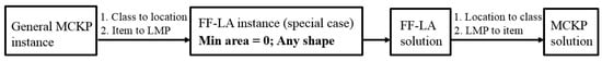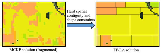 From the algorithmic optimization perspective, the fragmentation-free land allocation (FF-LA) problem is computationally challenging (formally, NP-hard) as we proved in [11]. Figure 2 shows that FF-LA can be reduced from the multiple-choice knapsack problem (MCKP). Here we also show a concrete special case of FF-LA that is equivalent to MCKP. In MCKP, we are given a finite set of classes, and each class has multiple choices. Each choice in each class has a profit value and a cost value. The goal is to select one and only one choice from each class that maximizes the profit under a cost constraint. In the general version of the FF-LA problem, we have a finite set of spatial locations, and each location has a set of multiple choices, where each choice has a profit value (e.g., a linear combination of multiple objectives) and a cost value. Each spatial location can be considered as a class in MCKP. As a special case, we can define the minimum area as 0, and the shape as any arbitrary shape. This special case is equivalent to a MCKP problem. Thus, given any MCKP instance, we can always construct an instance of this FF-LA special case in polynomial time. In addition, the solution of FF-LA can be mapped to MCKP by assigning the choice at each spatial location to each class, so this mapping can also be done in polynomial time. Thus, the general version of FF-LA is at least as hard as MCKP, which is NP-hard.