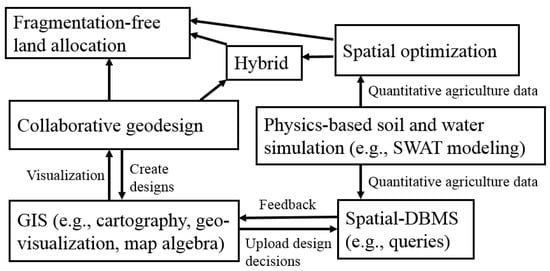 The overall architecture of fragmentation-free land allocation (FF-LA) is shown in Figure 4. Our three proposed frameworks to solve FF-LA are collaborative geodesign, spatial optimization and a hybrid model of both.