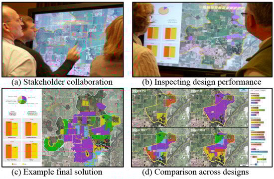 Software developed to engage stakeholders in creating and evaluating land allocations. (a) Stakeholders work together to hand-craft designs using the interactive interface. (b) Design performance is evaluated and returned to stakeholders for discussion. (c) An example design with charts showing performances. (d) Stakeholders can compare multiple designs and evaluate trade-offs.