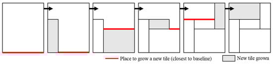 As discussed in [11], it is computationally prohibitive to solve the optimization problem exactly for a large-scale watershed (e.g., a grid with 1000 rows and 1000 columns), and a dynamic-growth tiling framework (DGTF) was proposed to heuristically search for a land allocation solution that satisfies all the spatial constraints. The idea is to start from a baseline (one side of the grid), and iteratively grow tiles on top of the baseline or existing tiles until the entire grid is filled up. In each step, we make sure the new tile satisfies the minimum area and width. As we proved in [11], if we always grow a new tile from the unoccupied place that is closest to the baseline, then we always have: (1) enough space to grow a new tile satisfying the spatial constraints; or (2) an adjacent tile which can be extended to fill up the space left. This process is illustrated in Figure 7. One property of DGTF is that it has a complete potential search space, which means any arbitrary rectangular tiling scheme can be reproduced by following the steps in DGTF [11].