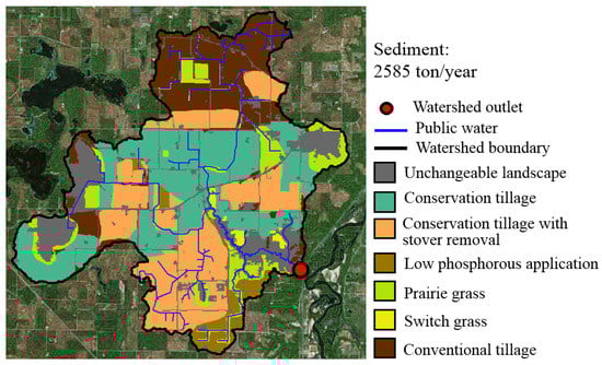 The result of the collaborative geodesign process was that different groups used a wide variety of land-use choices. Together, all of the different practices were used and included results that were not as efficient. Sediment (tons/year) was used to evaluate the water quality impact of the stakeholder design. As shown in Figure 8, the stakeholder design yielded a total sediment of 2585 tons per year, a reduction of 182 tons per year compared to the baseline scenario. Expert knowledge involved in this design can be seen at multiple places. For example, vegetative buffer strips of prairie grass were allocated along drainage ditches (Figure 8 bottom), to help filter out fertilizer residues and improve water quality. Conservation tillage with corn stover removal was allocated in large areas for greater economic return.