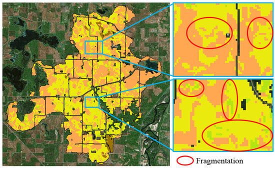 To demonstrate the importance of spatial constraints, we first show the integer programming solution without spatial constraints in Figure 9. The market return achieved by stakeholders was used as a cost constraint here so that the integer programming solution must have at least the same amount of market return. Without the spatial constraints, the choice on each grid cell was treated as an independent variable (its spatial adjacency was ignored). In Figure 9, we can see much evidence of land fragmentation. The boundaries of LMP patches tend to be curving with a large amount of local variations, which is difficult for farm equipment to maneuver through. When zoomed in, a large number of small LMP patches can be observed. This type of land fragmentation can significantly reduce the efficiency of farm equipment operations.