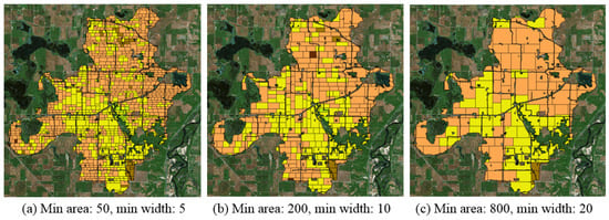 Fragmentation-free land allocation results with different spatial constraints. The minimum tile area and width gradually increase from (a–c). The total sediment of (a) is 1508 ton/year, (b) is 1597 ton/year and (c) is 1664 ton/year.