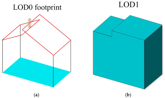 In CityGML, a building is represented through the blocks model (lod1Solid) in LOD1. One of the simplest methods of generating this structure involves extruding the footprint (lod0FootPrint) of a building in LOD0. The blocks model and footprint of a building are unified in CityGML and thus can be simultaneously represented. However, building footprints in LOD0 (Figure 2a) often describe buildings with different height values. In LOD1 (Figure 2b), these buildings should be modeled by extruding several footprints that are different from those in LOD0. Therefore, topological connections cannot be created between LOD0 footprints and the LOD1 blocks model in CityGML. Figure 2a,b show the LOD0 footprint and LOD1 model.