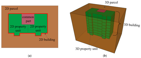 A cadastral object (i.e., a parcel) may represented by both 2D and 3D spatial units. Thus, 2DSpatialUnit and 3DSpatialUnit are associated through the field cadastreID. Figure 5 shows a case with a parcel and a building. The building consists of property units and common components. In Figure 5a, the parcel, building and property units are represented by 2D spatial units (2D parcel, 2D building and 2D property unit). In Figure 5b, the parcel, building and property units are represented by 3D spatial units (3D parcel, 3D building and 3D property unit).