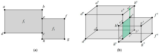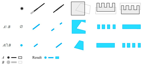 Boolean set operations are widely used in 3D modeling. Constructive solid geometry (CSG) [31], which was proposed by Requicha and Voelcker, constructs a complex object by using a tree of Boolean set operations. This approach has many practical applications in computer-aided designs and game engines, such as AutoCAD and the Unreal engine. Binary Space Partitioning (BSP) Trees [32] constructs a polyhedron by recursively partitioning subspaces, which can be used to speed up the intersection tests in CSG. However, this method does not support topology. Gursoz, Choi and Prinz [33] developed an algorithm for non-manifold boundary models that can perform Boolean operations between objects of different dimensionality and solids. The basic idea of this algorithm is to systematically handle singular intersections in an ordered manner from vertex to edge and face elements. Additional modeling approaches that involve Boolean set operations can be found in [34,35,36,37]. Few studies have examined Boolean set operations between extruded based models because these Boolean set operations can be converted to Boolean set operations between footprints.