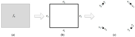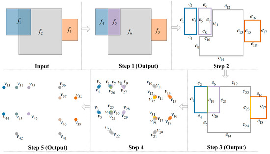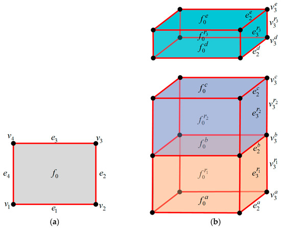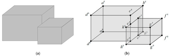 Figure 14 shows the geometric model and topological features that were constructed from the primitives in Figure 12b, in which the 3D edges and , 3D faces and , and volumes and are merged and redundancies (, and ) are removed.