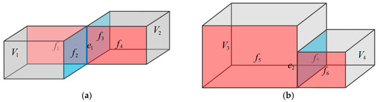 Another example shows the importance of the “which are not redundancies” designation. Figure 13b shows a spatial unit B that consists of two volumes ( and ). The 3D edge is the common edge of the three 3D faces , and , which does not fit the “only two” designation. However, e2 is a redundancy because is a redundancy as the common face of two valid volumes and and is associated to the same cadastral object of B, and touches only two valid 3D faces and , which are coplanar and associated with the same cadastral object B.