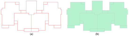 Figure 21a shows the contours of all the property objects (buildings) on Pozi Street. We used our DWG conversion tool to construct polygons and obtained the polygons of footprint faces for all the property objects on different floors (Figure 21b). Many overlaps occurred between these footprint faces.