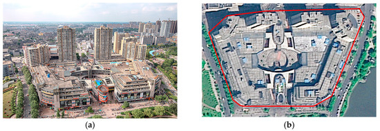 Pozi Street is the most famous landmark in Taizhou, Jiangsu, China, and is a commercial pedestrian street with commercial and residential space. Figure 17a,b show an overall image and an overhead view of Pozi Street, respectively, with the building area in Figure 17b denoted with a red border. The first floor contains many brand-name stores, such as TESIRO, SAMSUNG, and an Apple Store. The second and third floors include many gourmet restaurants and other stores, and apartments are located above the third floor. Additionally, the underground level beneath the first floor includes over 400 small stores that sell a variety of goods.