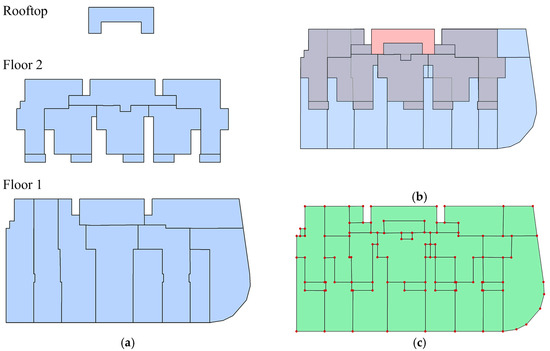 Building complex on Pozi Street: (a) rooftop, residential (Floor 2) and commercial footprint faces (Floor 1); (b) overlaps between footprint faces; and (c) non-overlapping footprint faces, edges and points that were generated by EABNOF.