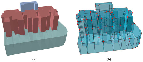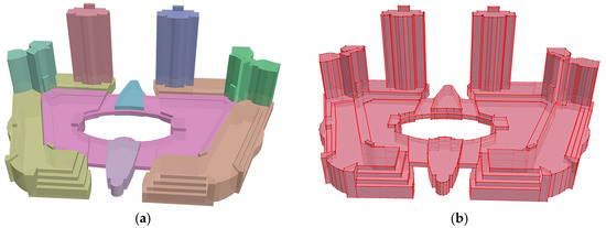 We used EABNOF to remove overlaps and generate non-overlapping footprint faces, edges and points (Figure 19c) with intervals. We obtained 33 footprint faces, 137 footprint edges and 105 footprint points. This combination of footprint faces could represent 2D spatial units of the building complex. We extruded footprints, removed redundancies and merged primitives to obtain 3D geometric models and topological features for the 3D spatial units of the building complex, which are shown in Figure 20a,b.