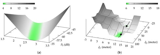 Just optimizing and with constant and known transmitter position usually means optimizing a convex function, as can be seen in Figure 1a. For such error functions, algorithms like gradient descent and simplex [,,] are well suited and will provide the global minimum.