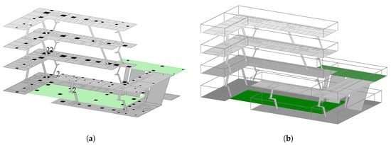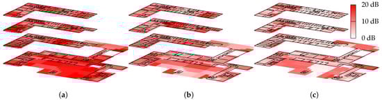 In Equation (10), a constant attenuation factor is multiplied by the number n of floors/ceilings between the sender and the location in question. The attenuation (per element) depends on the building’s architecture, and for common, steel-reenforced concrete floors, is a viable choice [].