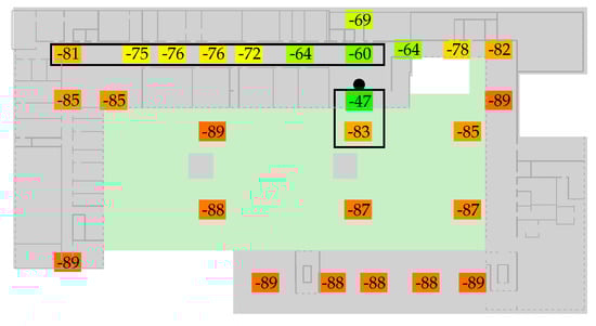 As previously mentioned, for the prediction model to work, it is necessary to know the location for every permanently-installed access-point i within the building to derive the distance d, plus its environmental parameters , and . While it is possible to use empiric values for those environmental parameters [], the positions are mandatory.