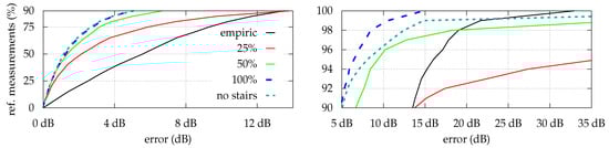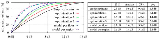 Figure 6 depicts the impact of reducing the number of reference measurements during the optimization process for the model per region strategy. The error is determined by using the (absolute) difference between expected signal strength and the optimized model’s corresponding prediction for all of the 121 reference measurements. Considering only 60 of the 121 scans (50%) yields a slightly increasing model error but still provides good results. While using only 25% of the reference measurements increases the error rapidly, for 75% of the 121 considered error-values, the estimation is still better than using just empiric values without optimization.