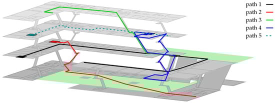 Overview of all conducted paths, each starting at the denoted rectangle. Outdoor areas are marked in green. The length of the paths is as follows: Path 1: 207 m, Path 2: 138 m, Path 3: 86 m, Path 4: 140 m, and Path 5: 97 m.