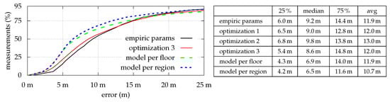The position estimation for each Wi-Fi measurement within the recorded walks (3756 scans in total) is compared against its corresponding ground truth, indicating the 3D distance error. This is the Euclidean distance (in ) between estimation and ground truth, calculated for every Wi-Fi measurement (approximately every 600 ms). The resulting cumulative error distribution can be seen in Figure 8. The quality of the location estimation directly scales with the quality of the signal strength prediction model. However, as discussed earlier, the maximal estimation error might increase for some setups. Either due to multi-modalities, where more than one area matches the recent Wi-Fi observation, or optimization yielded an over-adaption where the average signal strength prediction error is small, but the maximum error is dramatically increased for some regions.